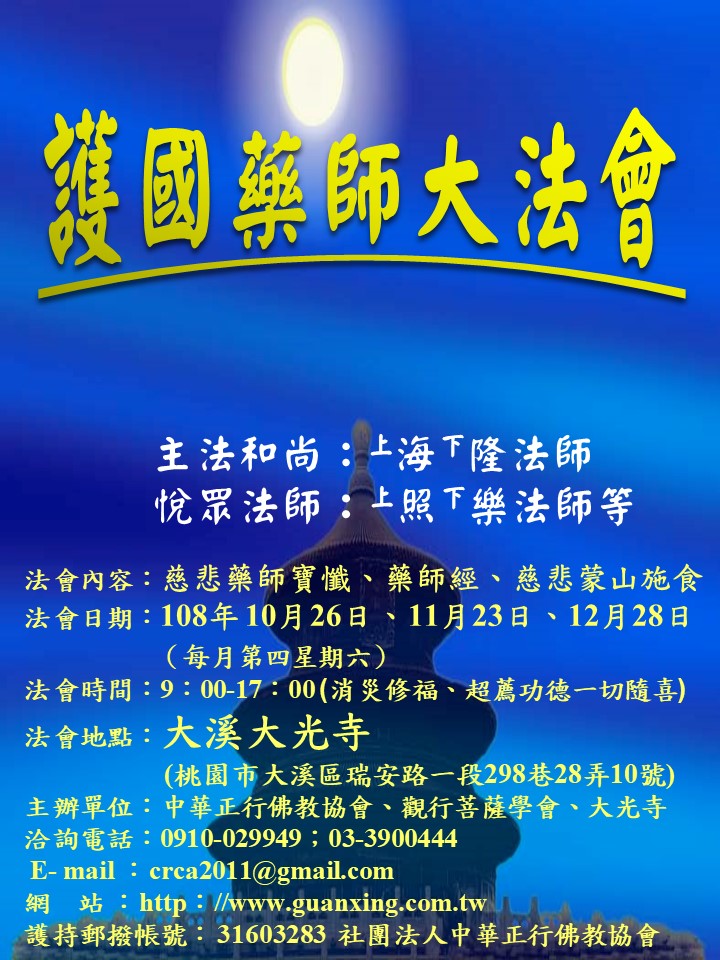 護國藥師大法會108年10月26日、11月23日、12月28日(每月第四星期六) am9:00~pm17:00